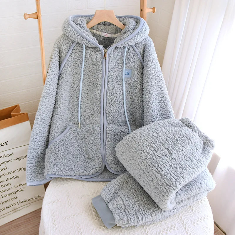Ciepła Piżama Dla Par SoftCuddle – przytulny komplet z zamkiem błyskawicznym, zapewniający wyjątkowe ciepło i komfort dla obojga. Idealny do wspólnego relaksu w chłodne wieczory, oferuje łatwość zakładania i zdejmowania.